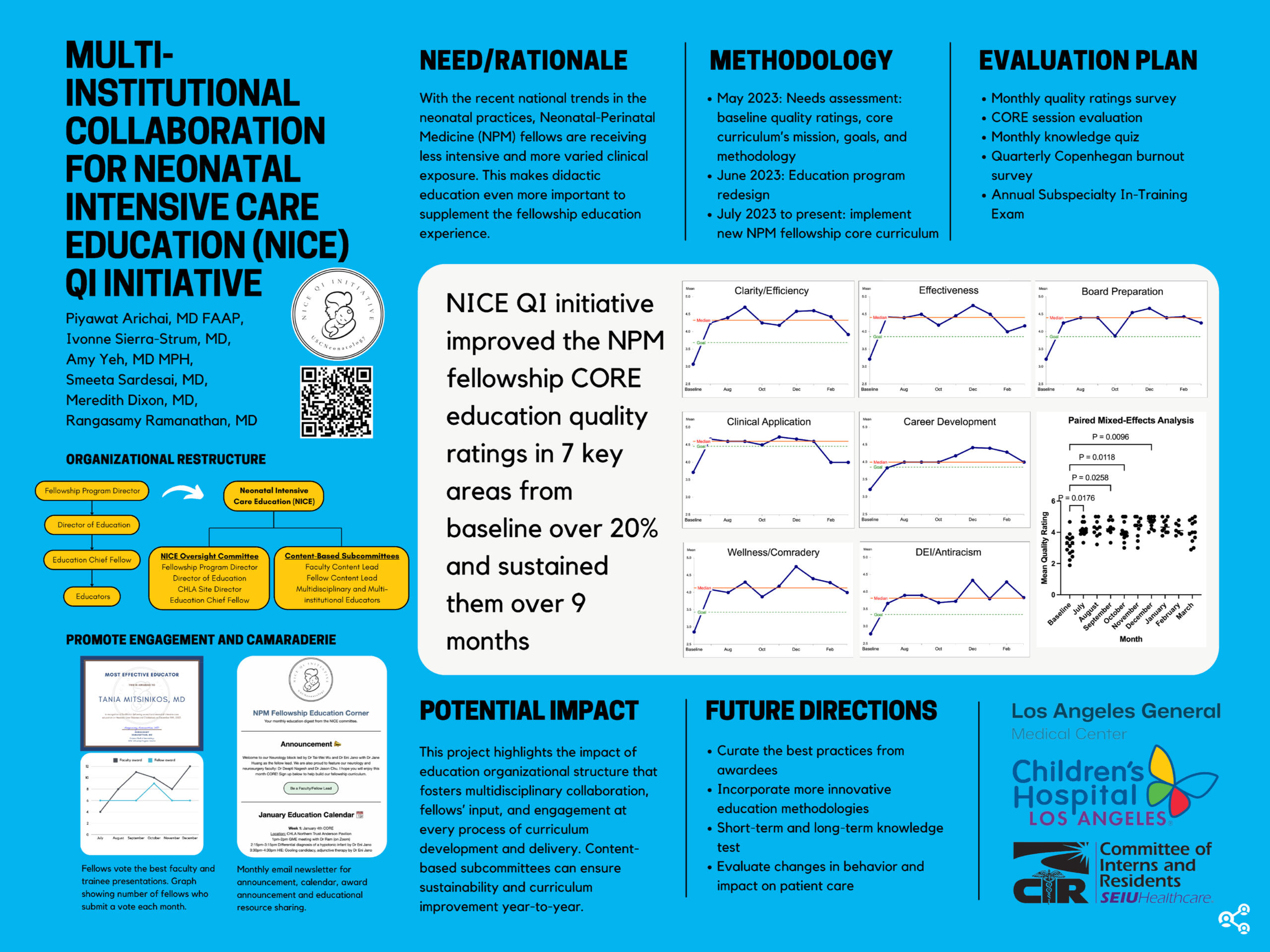 The NICE QI initiative improved the NPM fellowship CORE education quality ratings in 7 key areas from baseline over 20% and sustained them over 9 months.